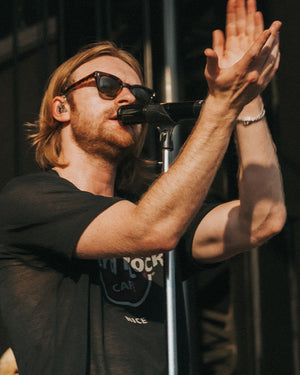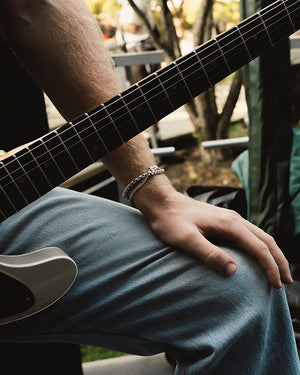 Lalapalooza: FINNEAS wears the Love Knot Bracelet and Box Chain Bracelet in Sterling Silver.